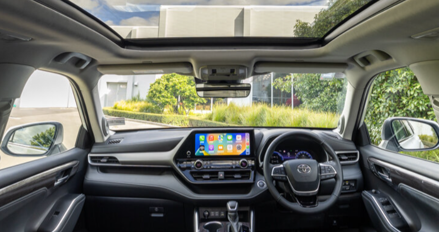 По технике Highlander 2026 не выглядит старым. У модели доступны 12.3-дюймовая мультимедиа, 12.3-дюймовая цифровая приборка, беспроводные Apple CarPlay и Android Auto, премиальная аудиосистема JBL в старших комплектациях, панорамная крыша и нормальный набор семейных удобств.